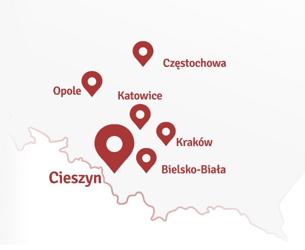 Nasza hurtownia mieści się w Cieszynie. Ze względu na lokalizację siedziby naszej firmy nasi handlowcy odwiedzają systematycznie klientów z miast takich jak: Bielsko-Biała, Częstochowa, Katowice, Kraków, Opole,